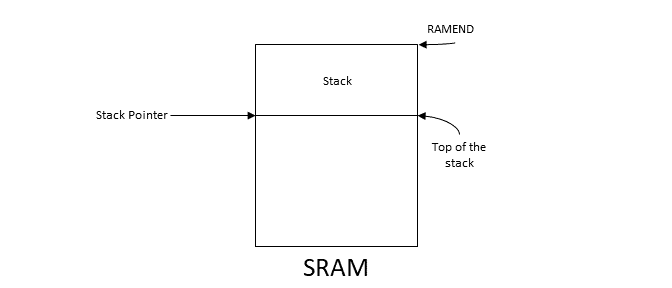Typically, the stack begins at the end of SRAM, and will grow from higher to lower address values when data is stored in it. The stack pointer always points to the top of the stack.